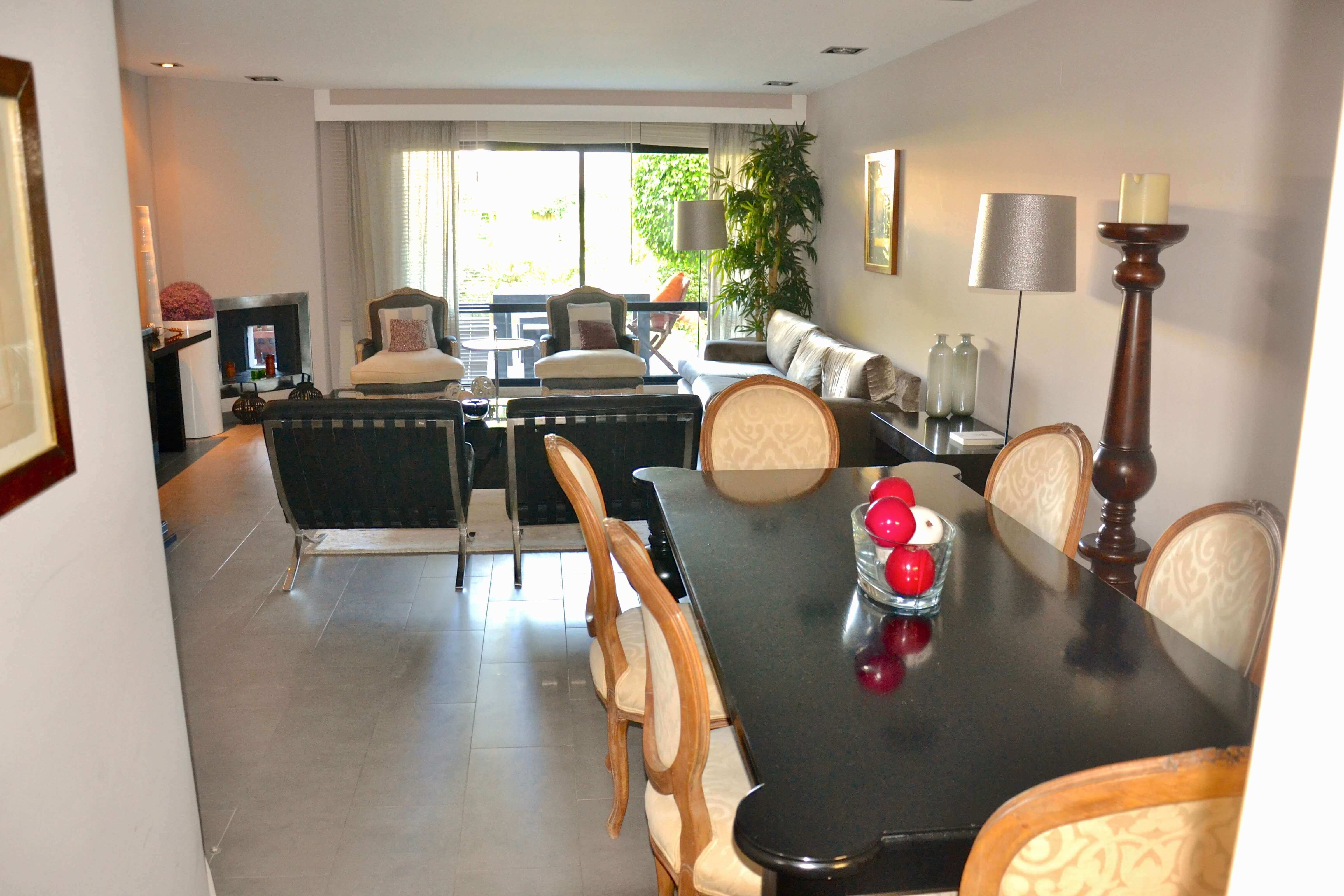 Este apartamento de bom gosto e luxuoso, no rés do chão, com interior recentemente concluído, inclui uma grande sala e área de jantar que tem vista para um espaço privado no jardim.