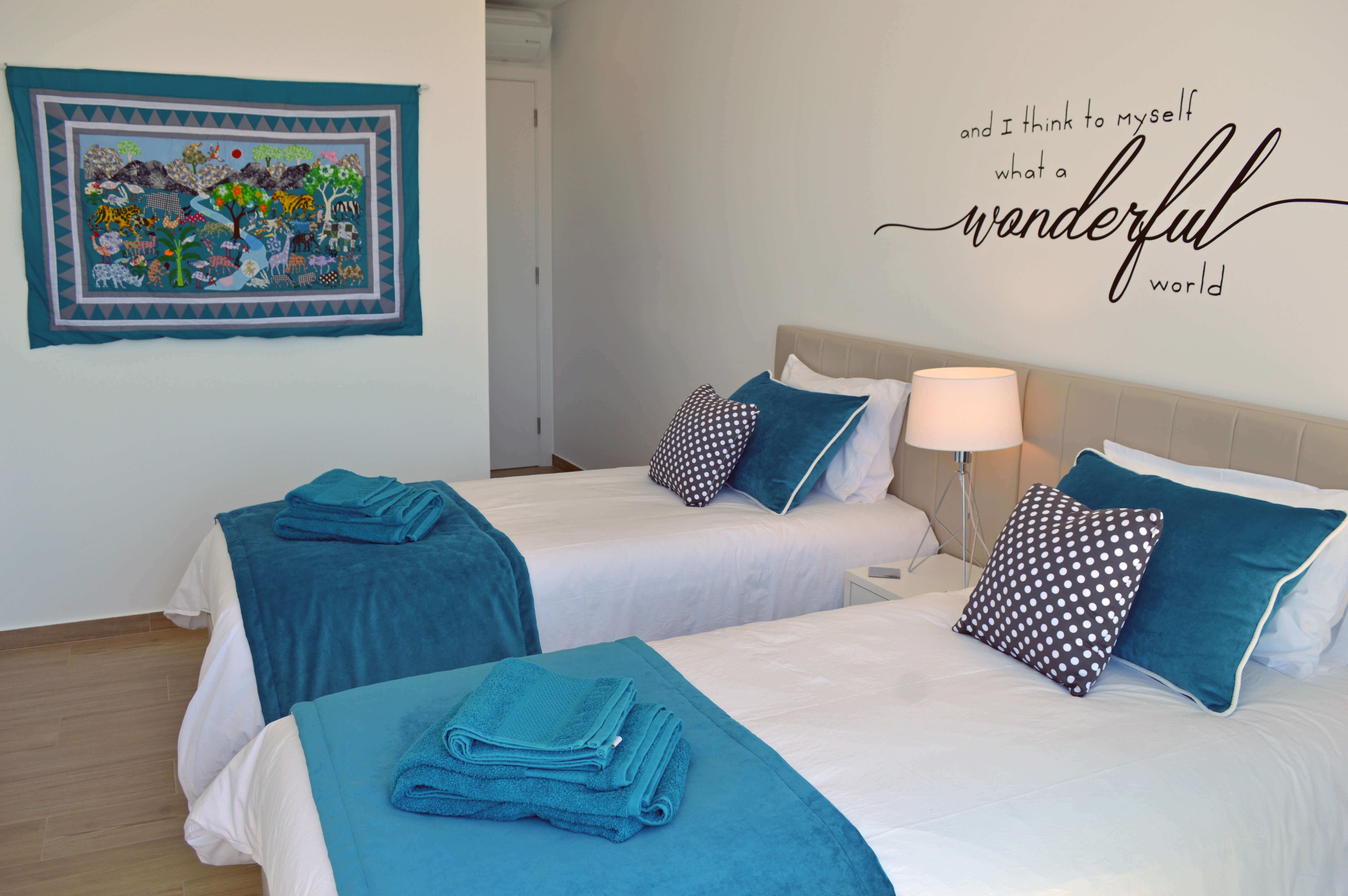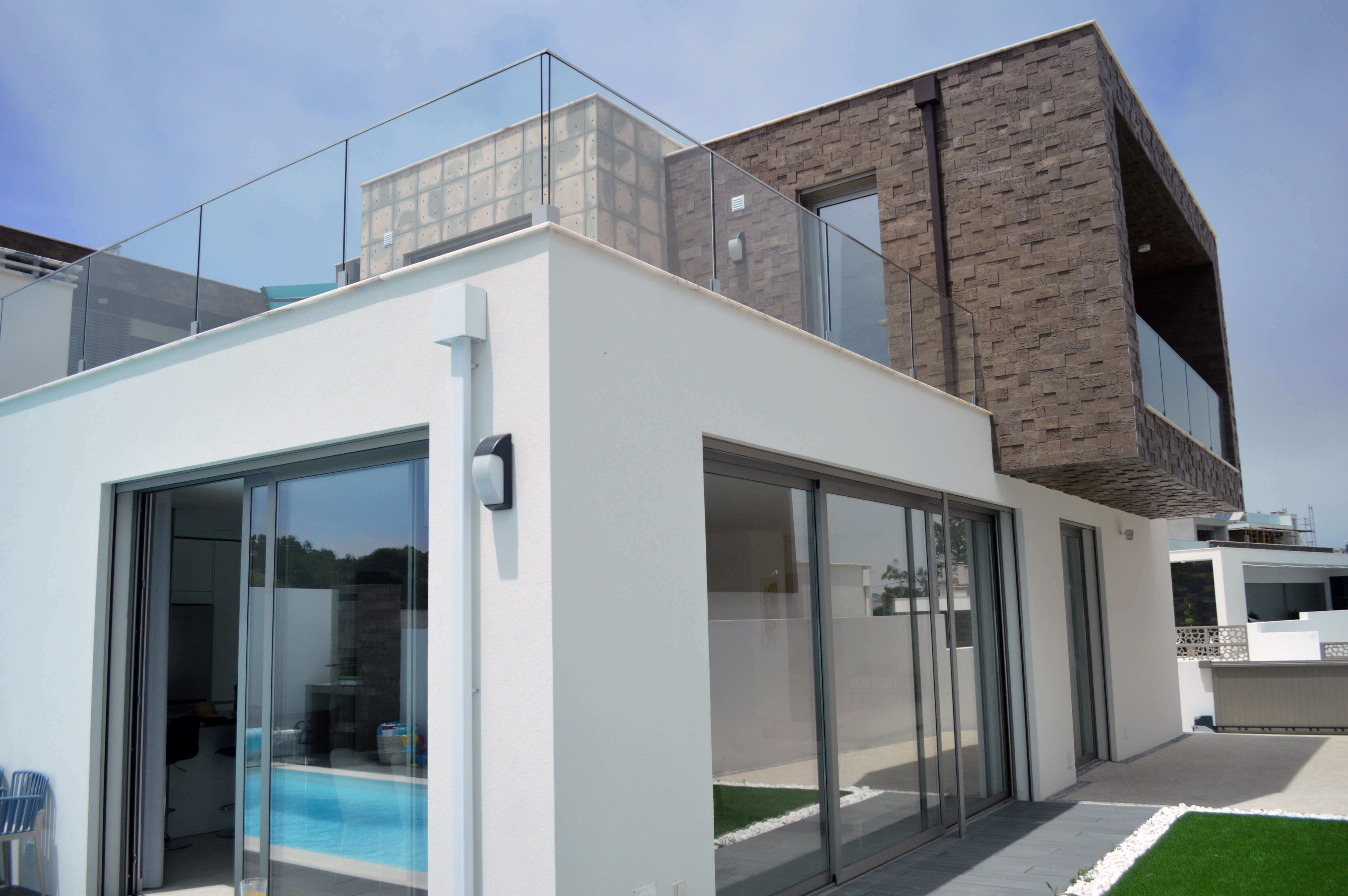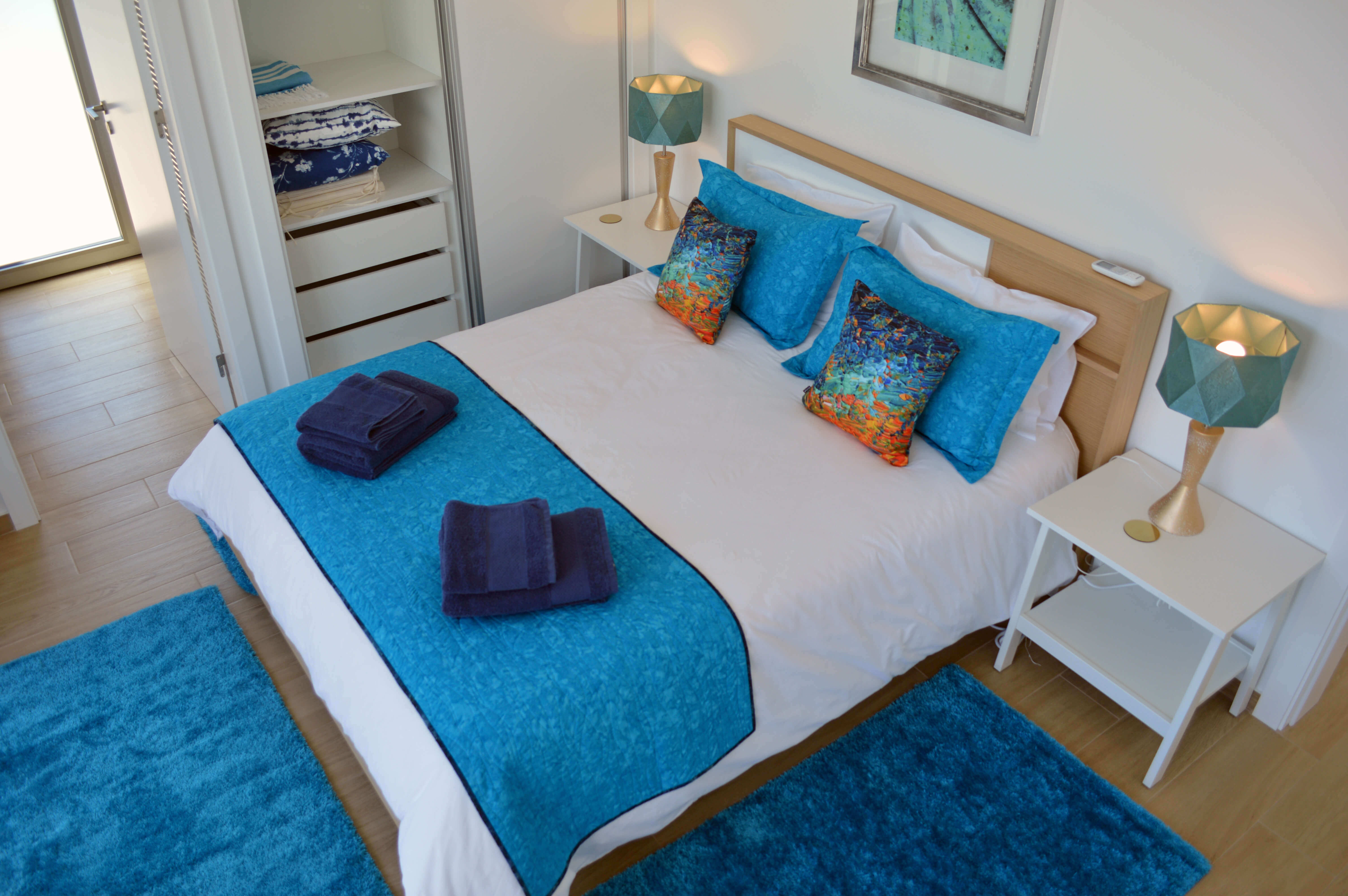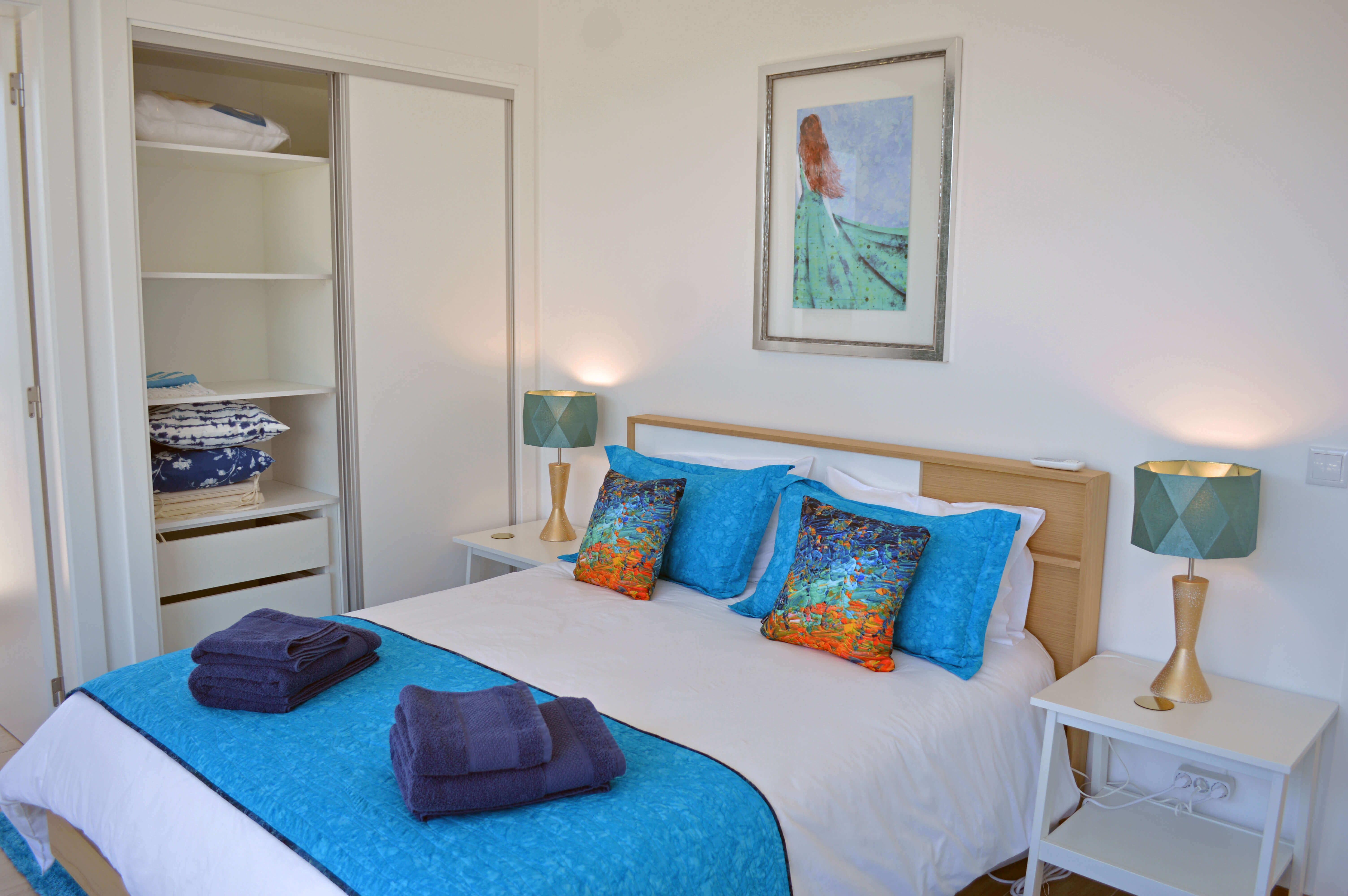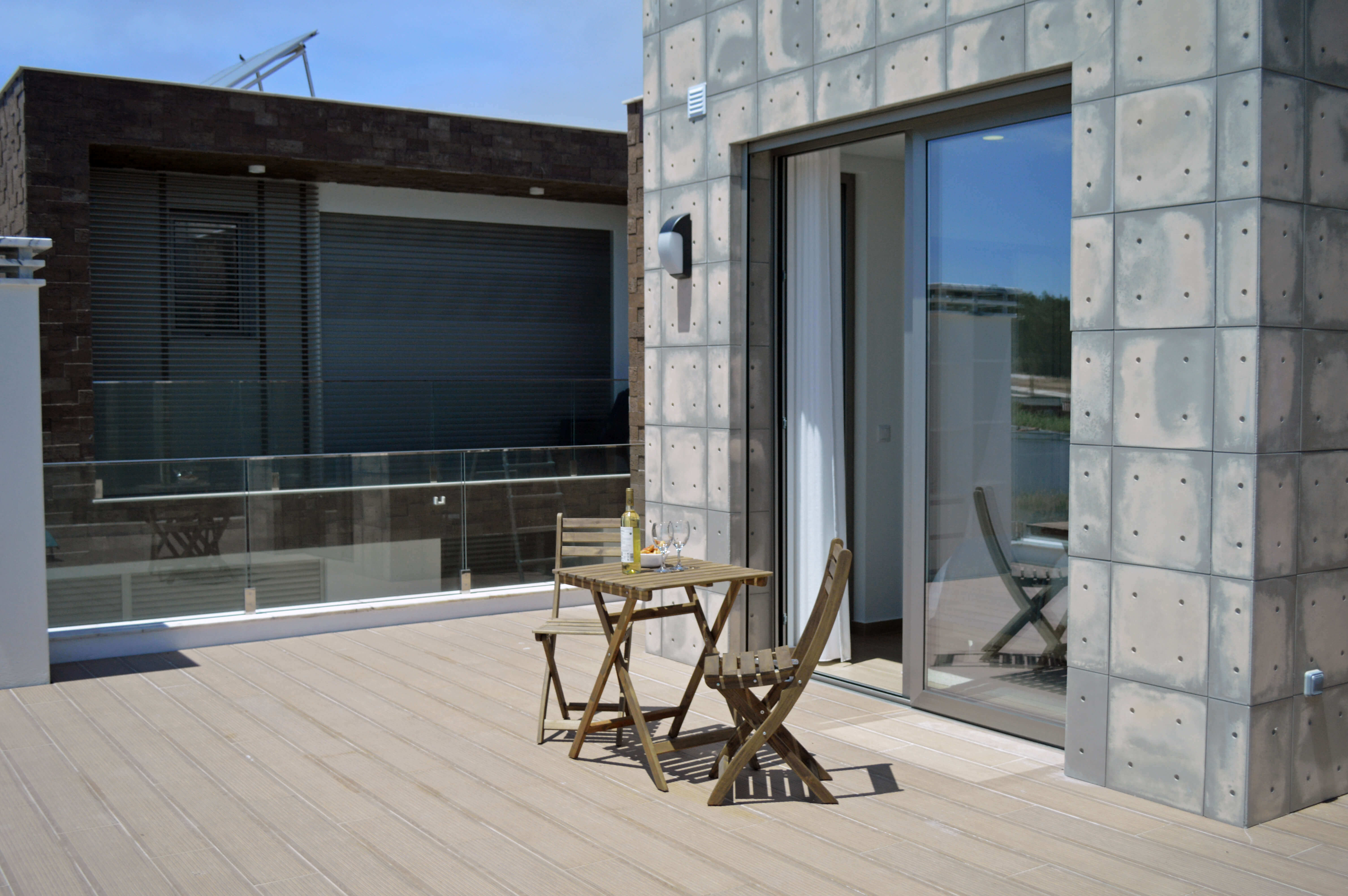 Esta moderna vivenda de 2 andares foi equipada e decorada a um excelente nível e irá satisfazer todas as suas necessidades durante a sua estadia. Os quartos estão dispostos como 2 quartos de casal e um quarto duplo. Há um quarto de casal no piso térreo, com acesso ao terraço principal e adjacente a este quarto, está uma casa de banho com cabine de duche. No andar de cima, ambos os quartos têm casa de banho privativa e acesso a varandas com mesa e cadeiras para dois. A propriedade pode acomodar até 6 pessoas em todo o conforto.