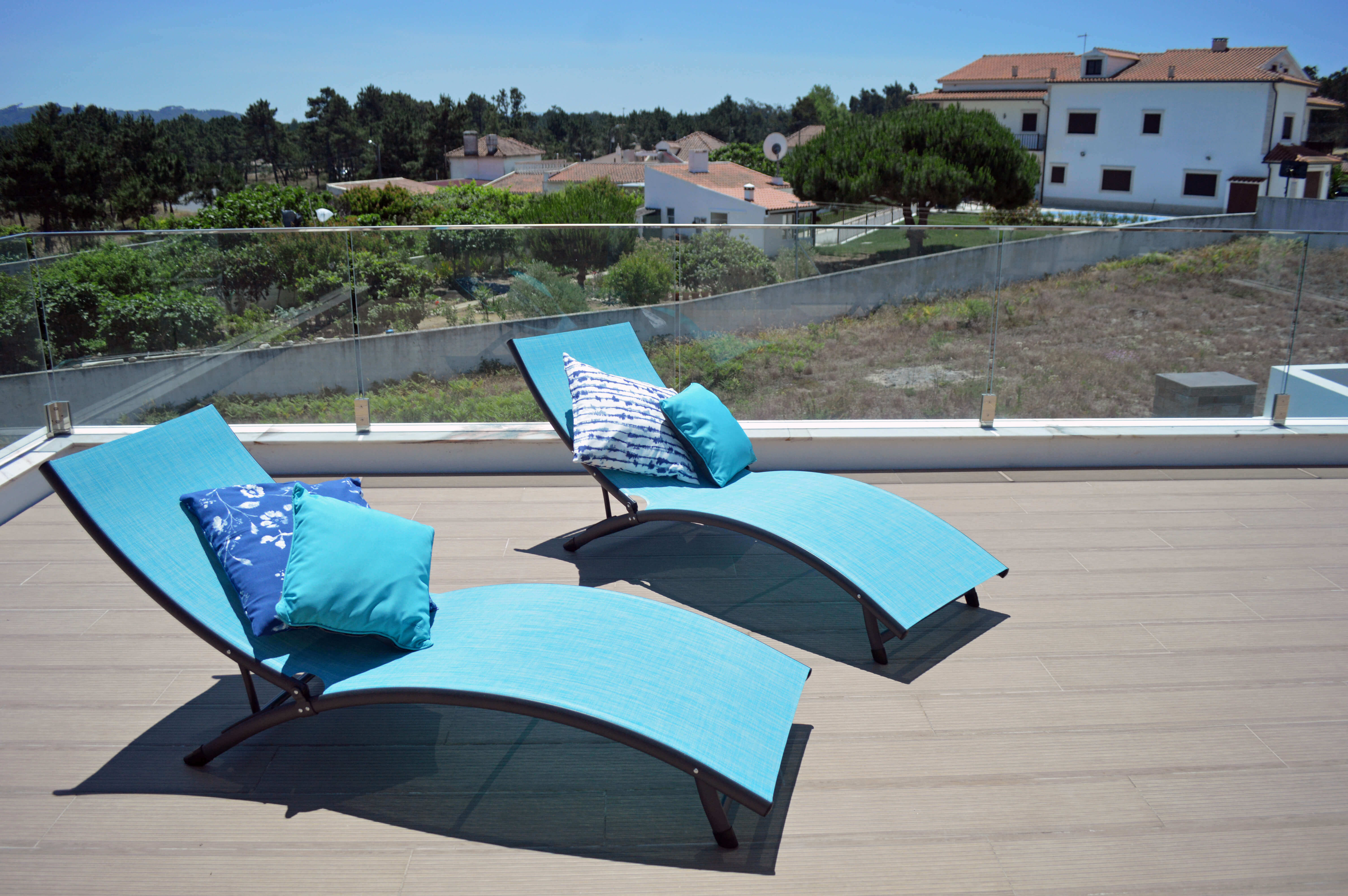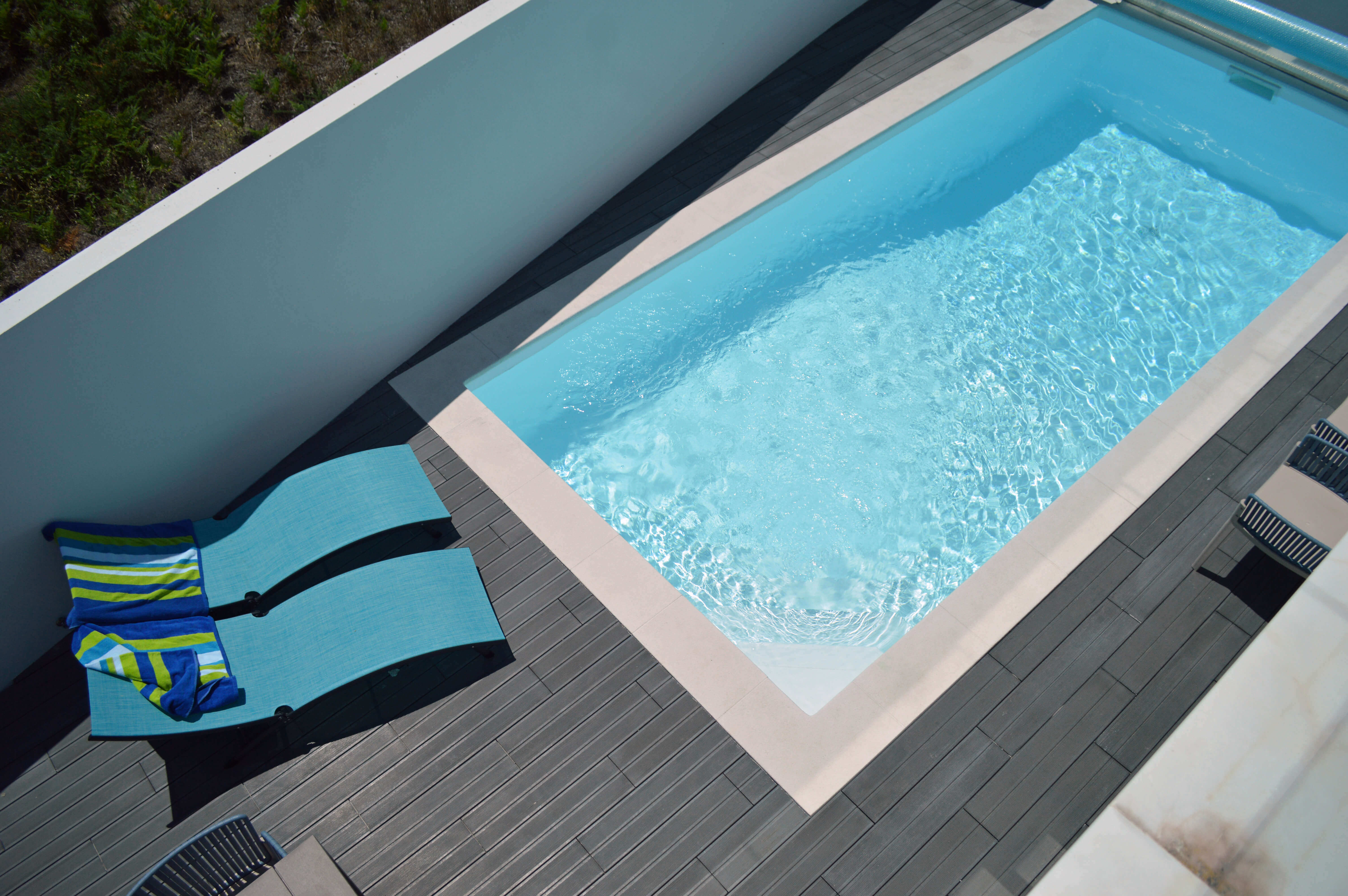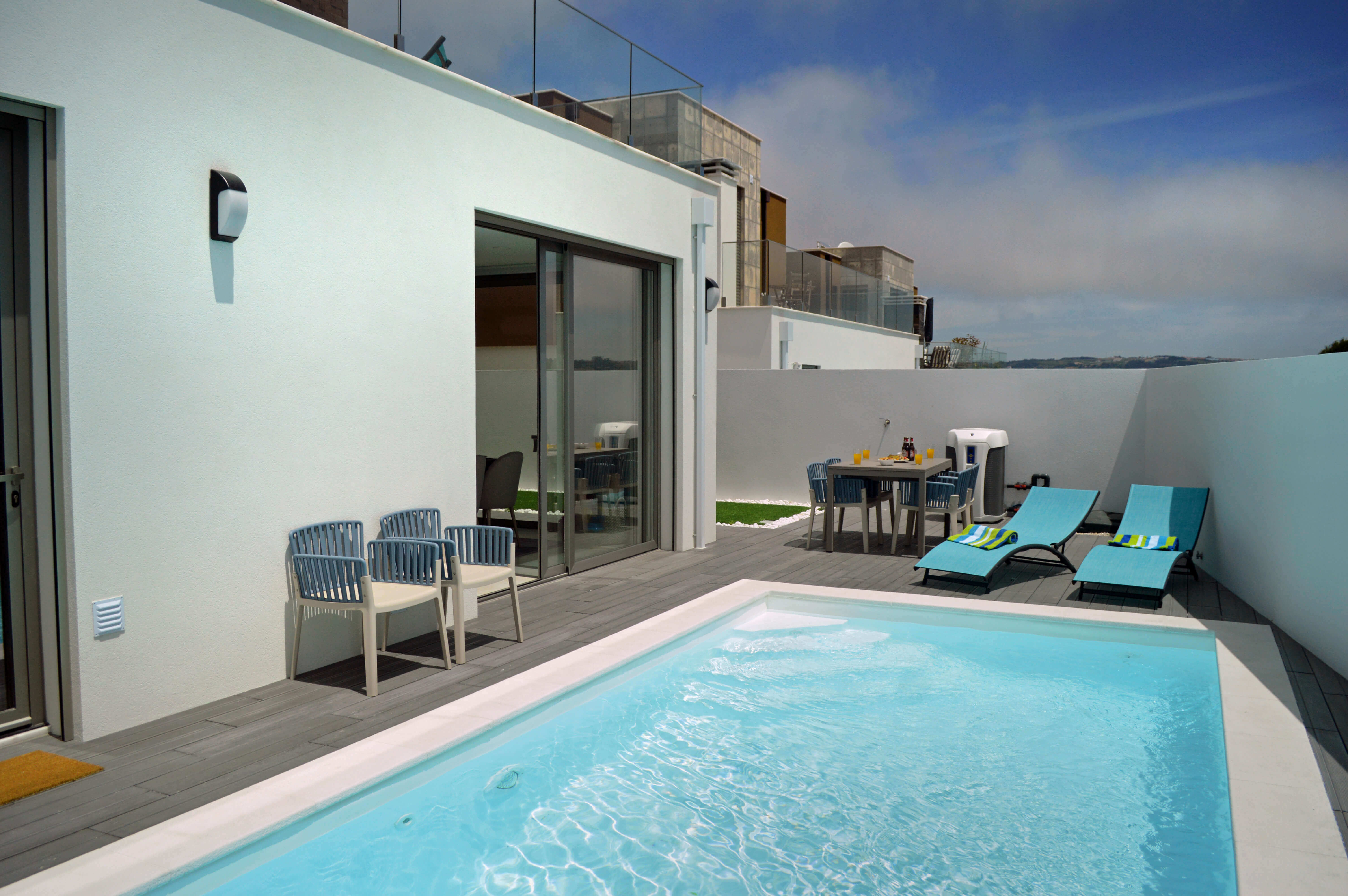 Todas as três áreas abrem para o terraço principal, onde encontrará uma piscina aquecida, algo raro de encontrar, móveis de exterior para refeições ao ar livre, churrasqueira embutida e 2 espreguiçadeiras para simplesmente relaxar e aproveitar o sol. Há mais 2 espreguiçadeiras na varanda do quarto duplo, com vista para a piscina. Para tornar a sua estadia ainda mais completa, a proprietária atenciosamente forneceu 6 toalhas de praia e 2 conjuntos de brinquedos de praia para crianças.