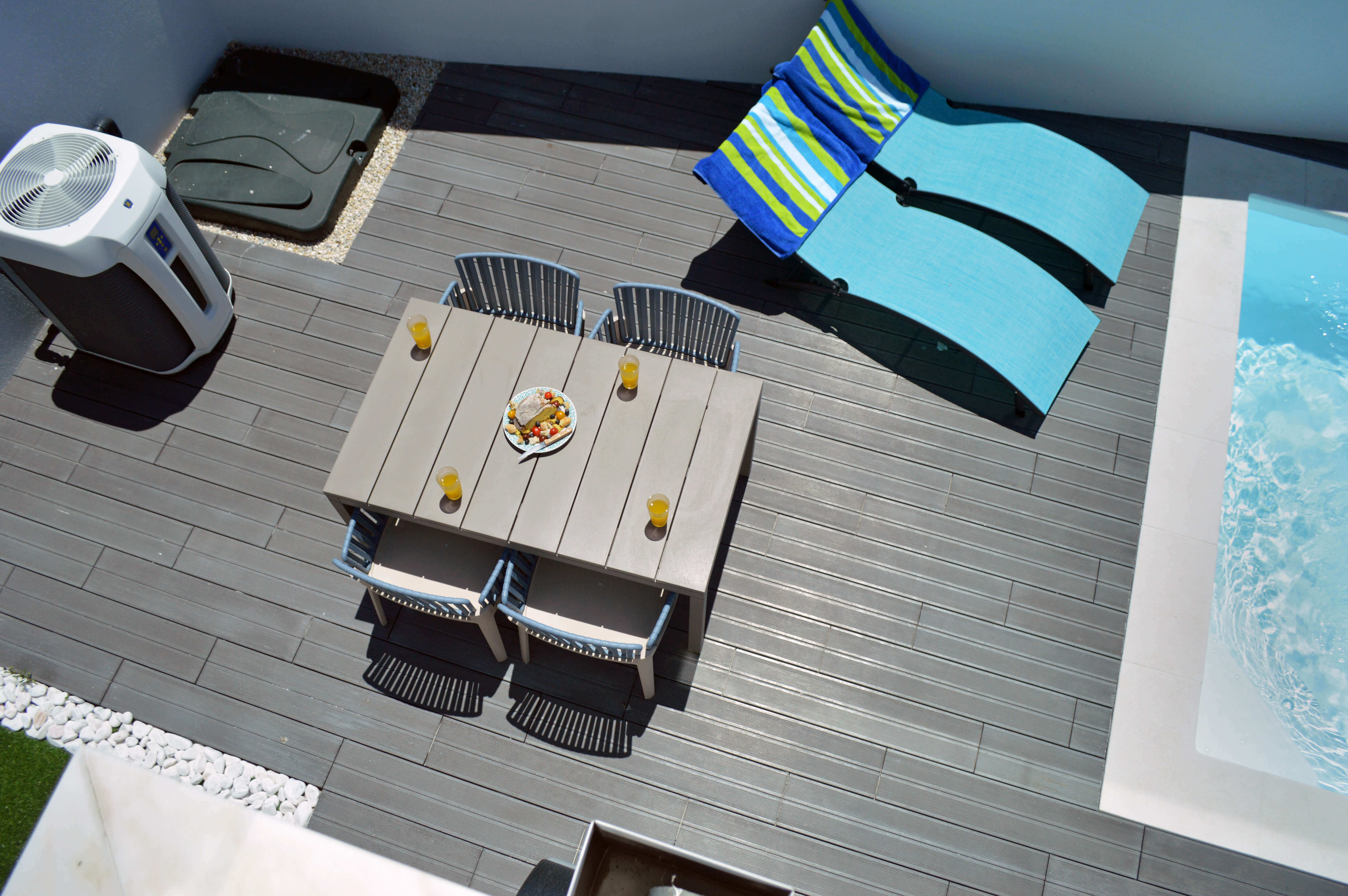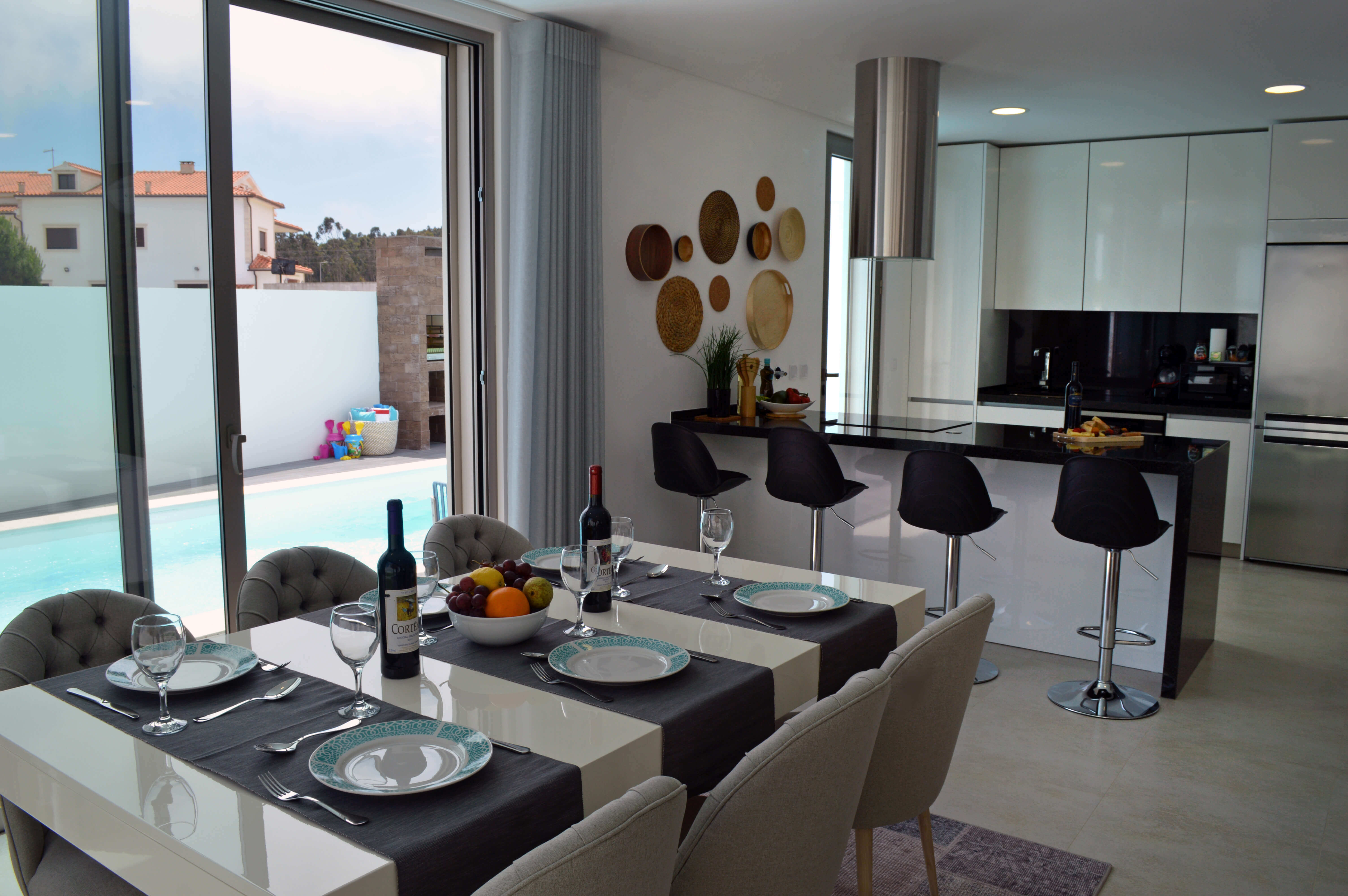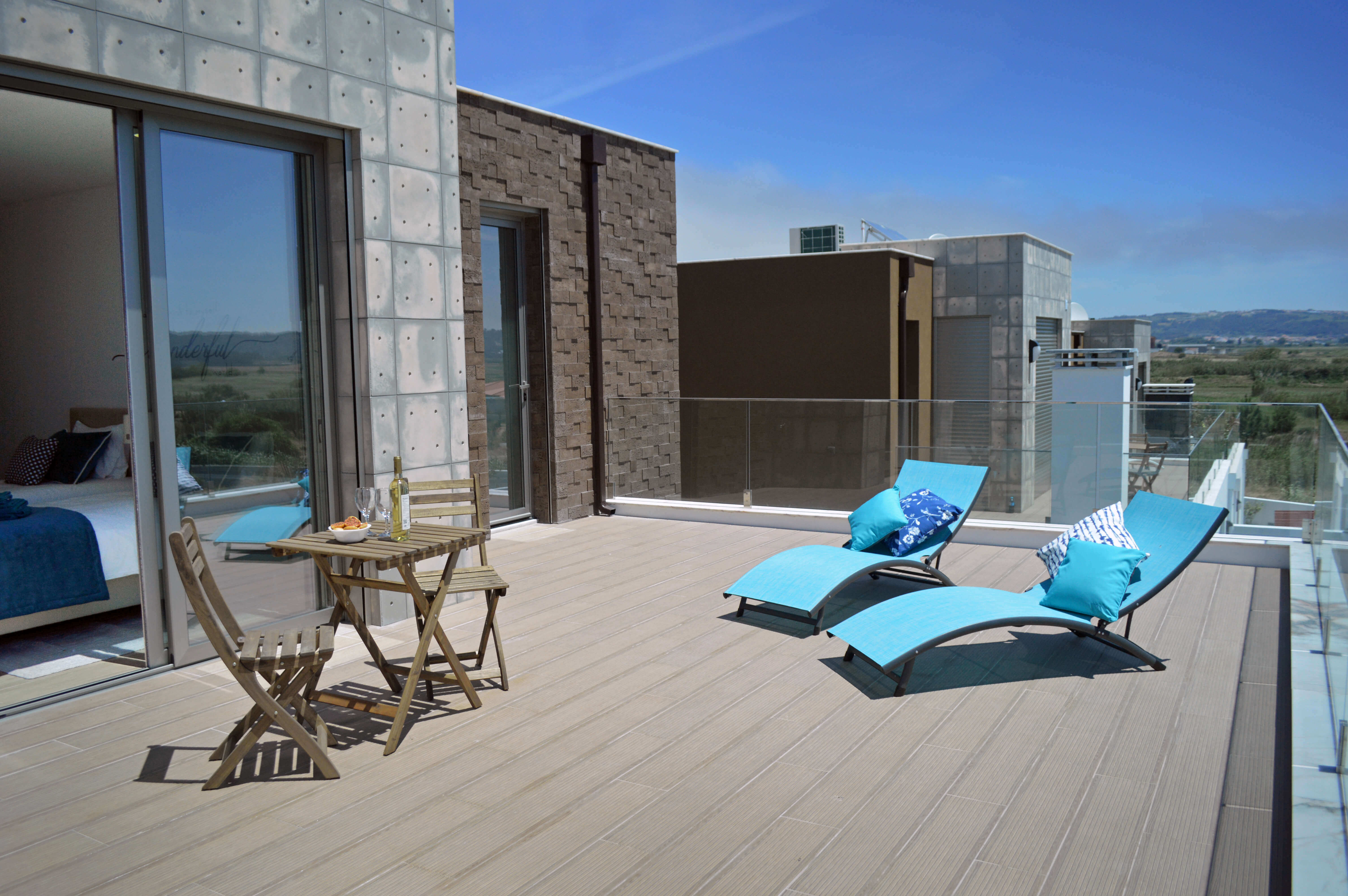 Todas as três áreas abrem para o terraço principal, onde encontrará uma piscina aquecida, algo raro de encontrar, móveis de exterior para refeições ao ar livre, churrasqueira embutida e 2 espreguiçadeiras para simplesmente relaxar e aproveitar o sol. Há mais 2 espreguiçadeiras na varanda do quarto duplo, com vista para a piscina. Para tornar a sua estadia ainda mais completa, a proprietária atenciosamente forneceu 6 toalhas de praia e 2 conjuntos de brinquedos de praia para crianças.