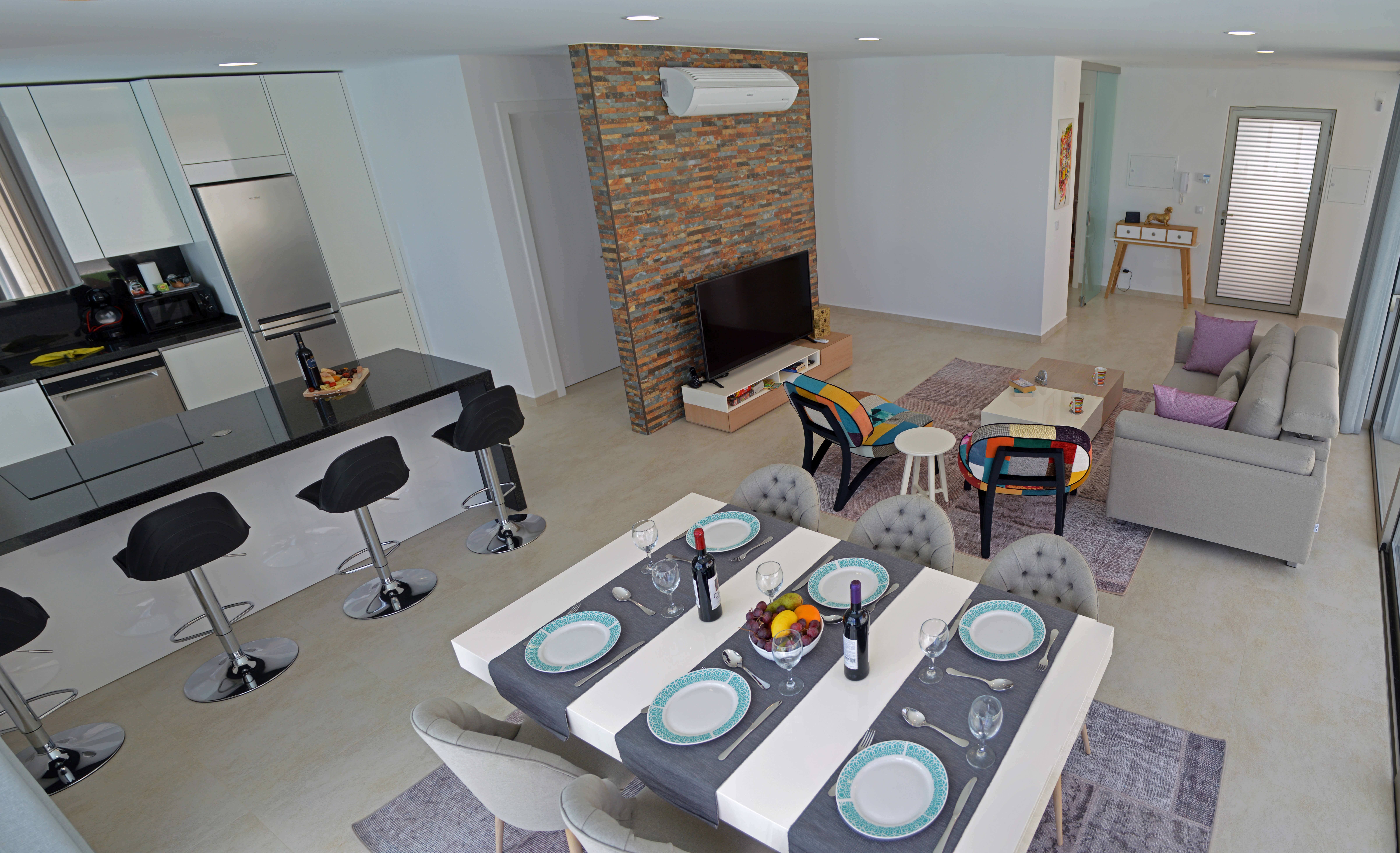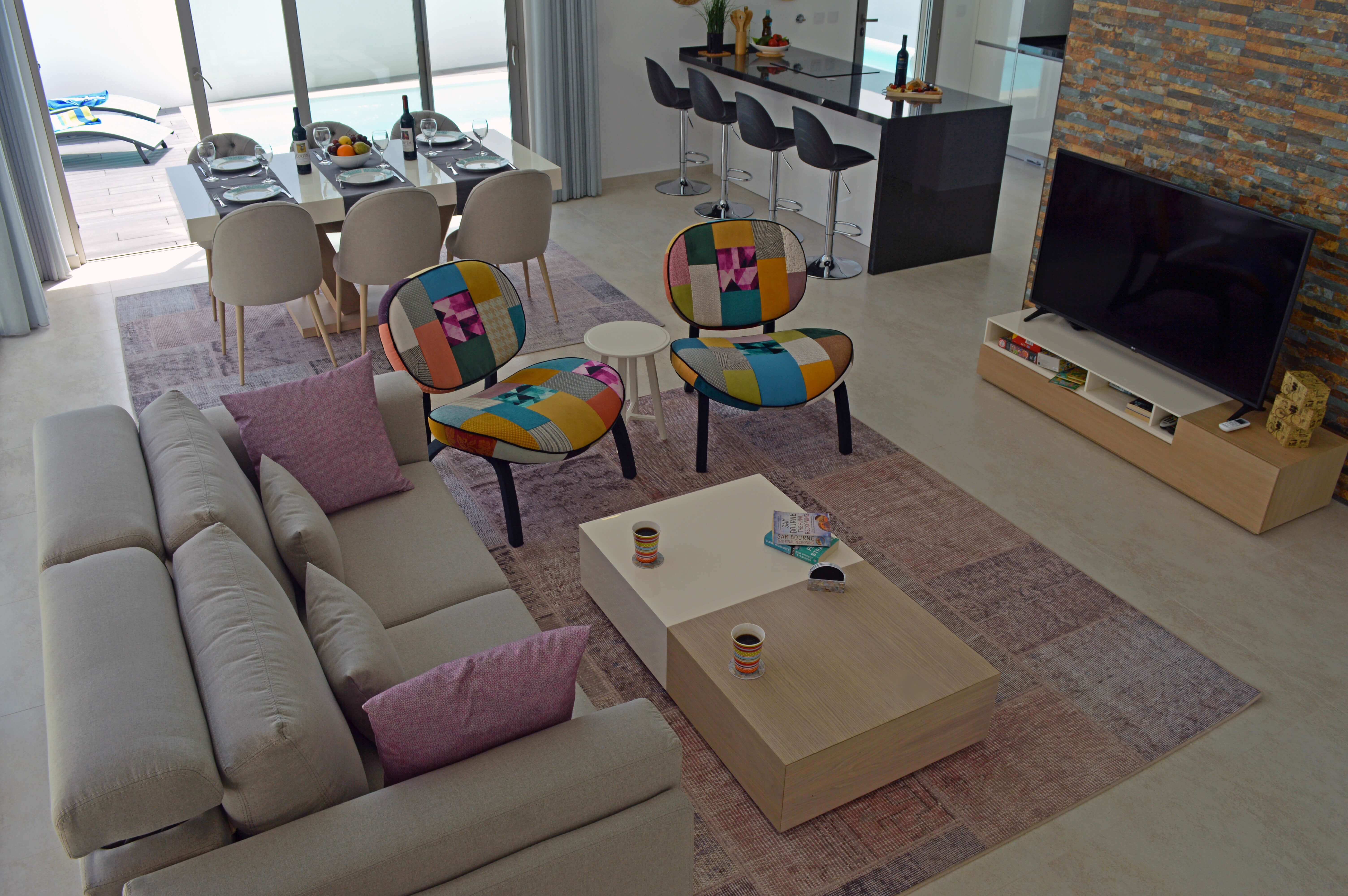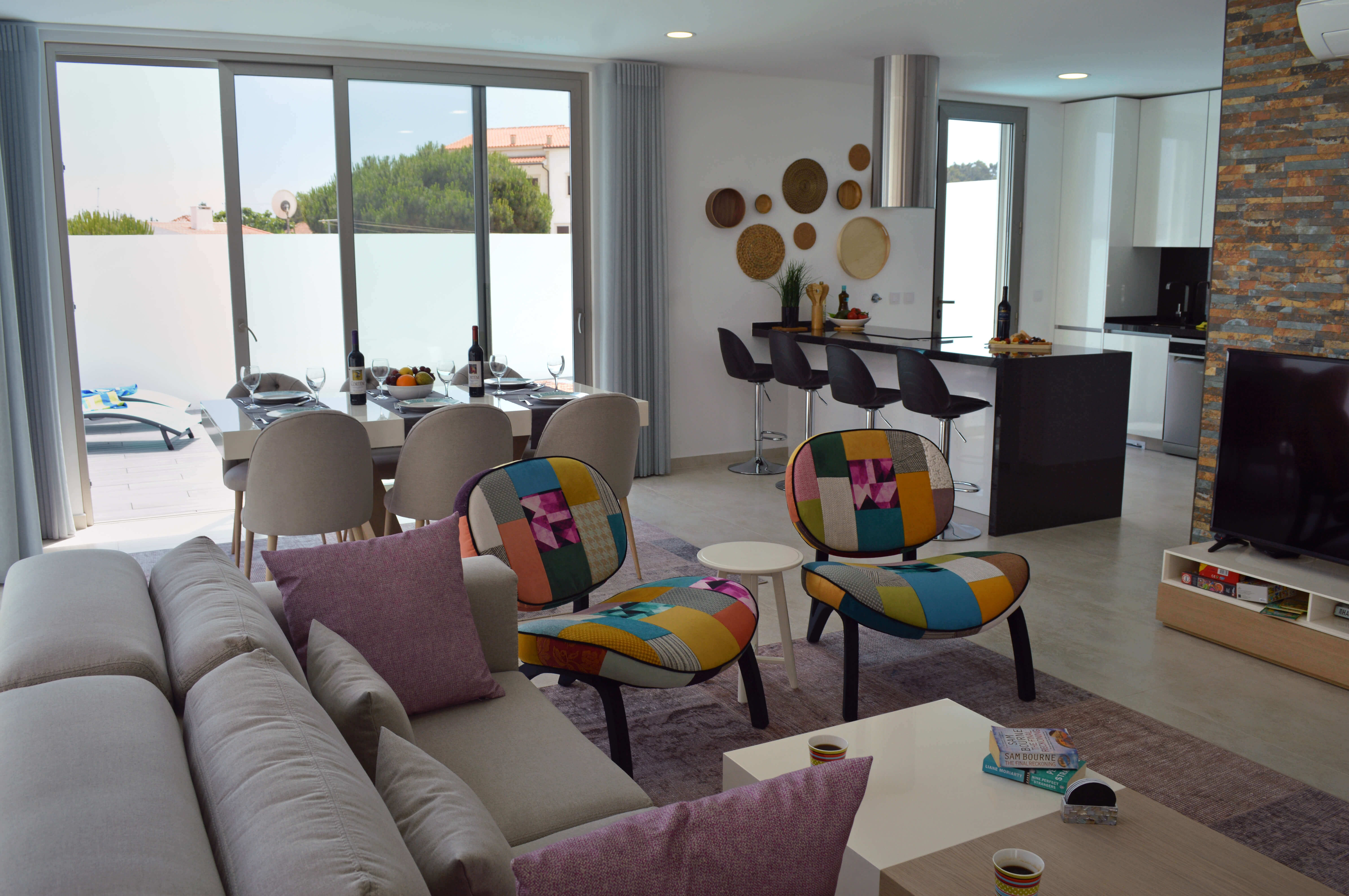 A sala de estar é uma ampla e espaçosa área aberta, onde lounge, cozinha e área de jantar convergem para providenciar um local e ambiente ideal para o entretenimento da sua família e amigos. O salão apresenta assentos confortáveis, uma televisão com canais por satélite, leitor de DVD, livros, jogos de tabuleiro e também acesso Wi-Fi gratuito para aqueles que querem ficar conectados.