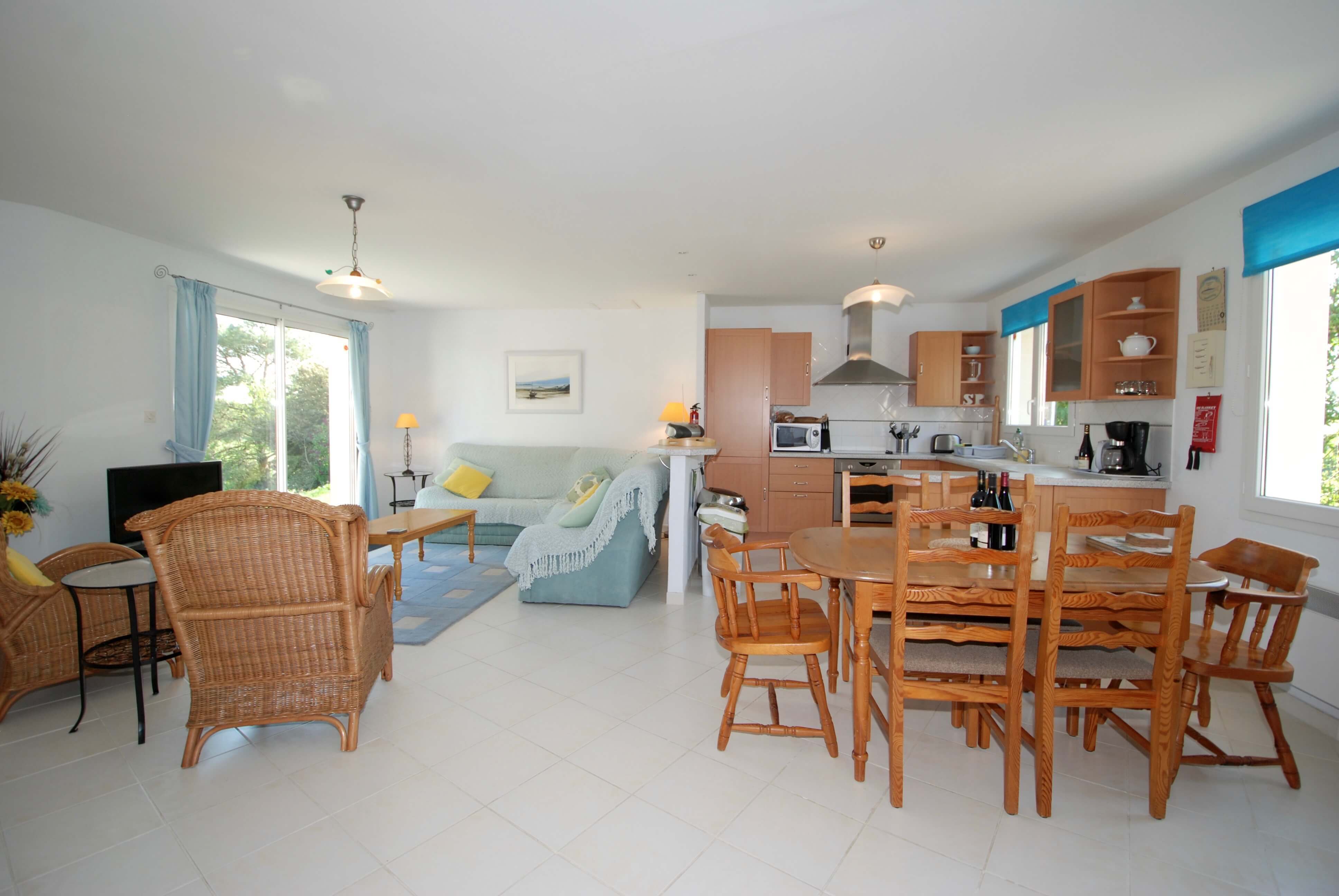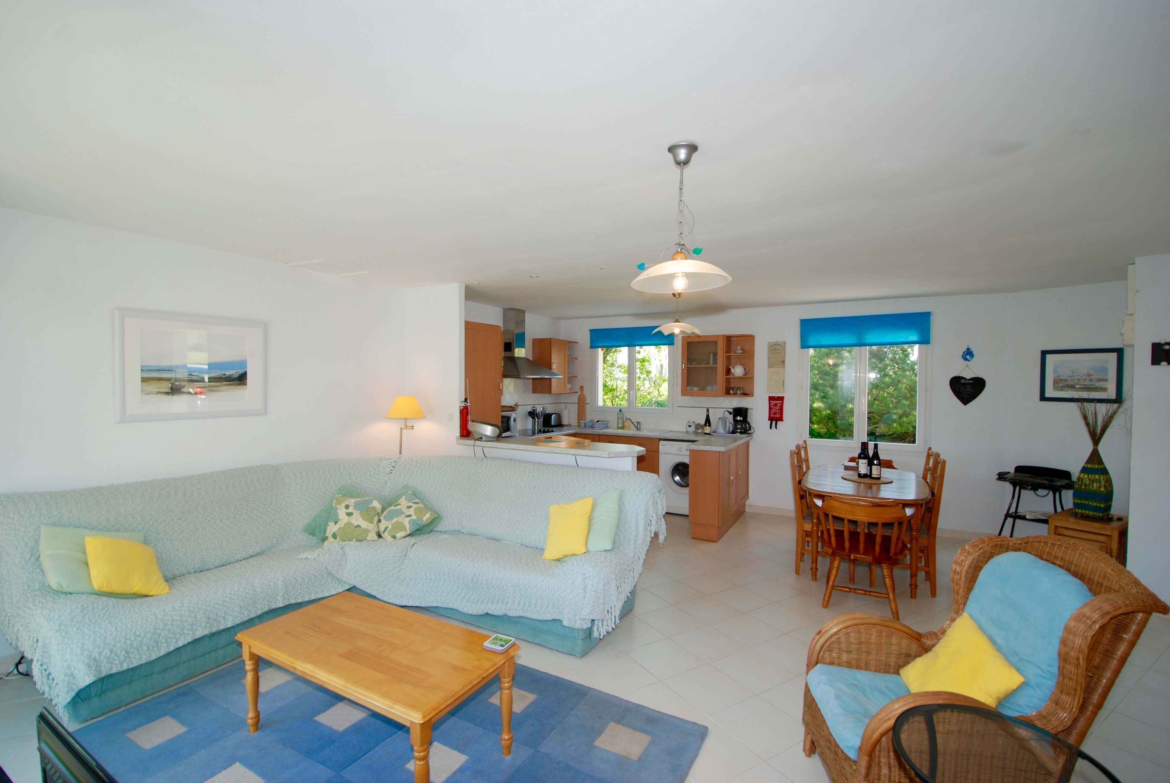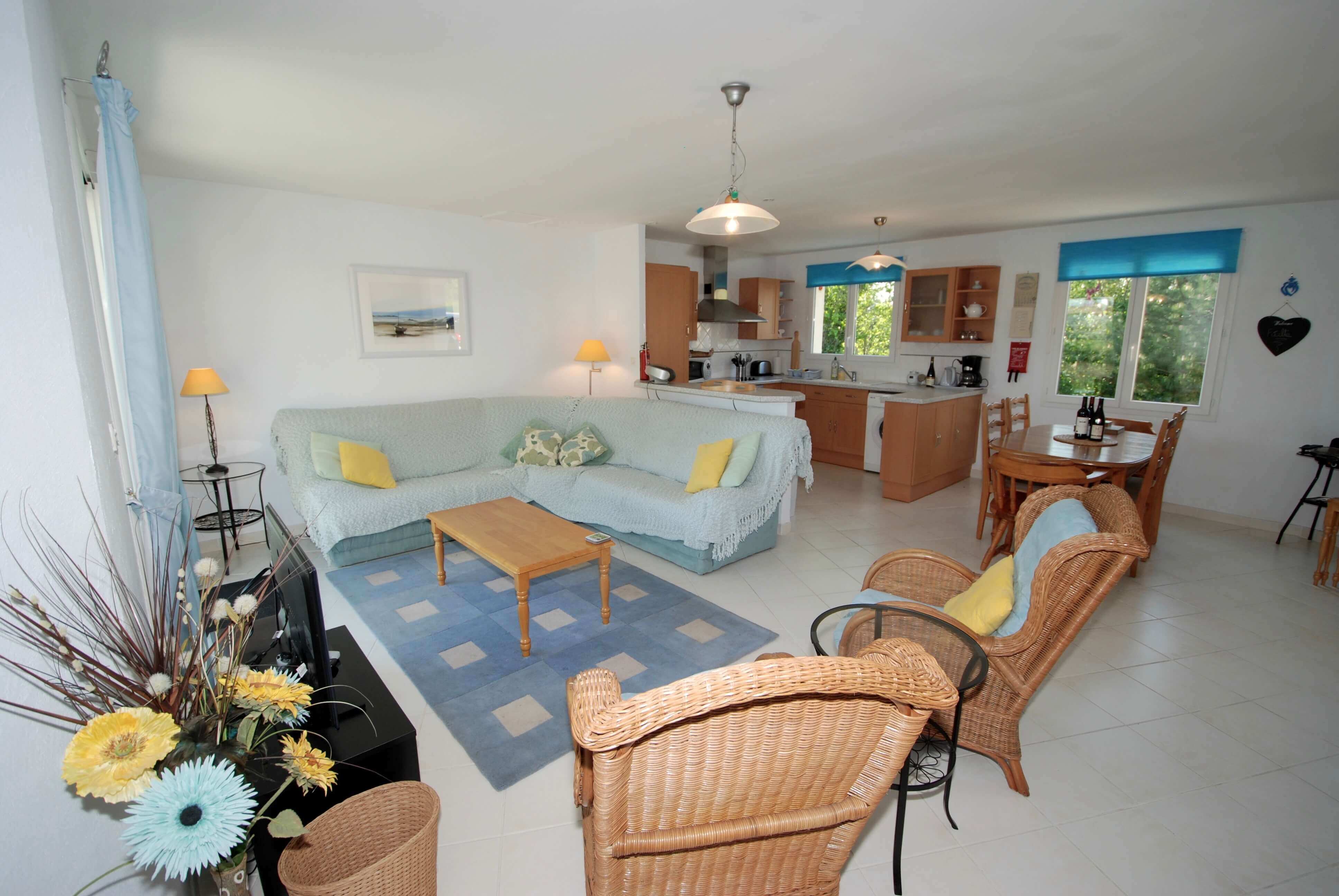 A propriedade uma grande e ampla sala de estar com estores eletricos, TV por satélite, leitor de DVD, rádio/cassetes/leitor de CD, fogueira eléctrica com efeito de carvão, sofá de canto, área de jantar que acomoda 6 pessoas e uma cozinha bem equipada, incluindo máquina de lavar.