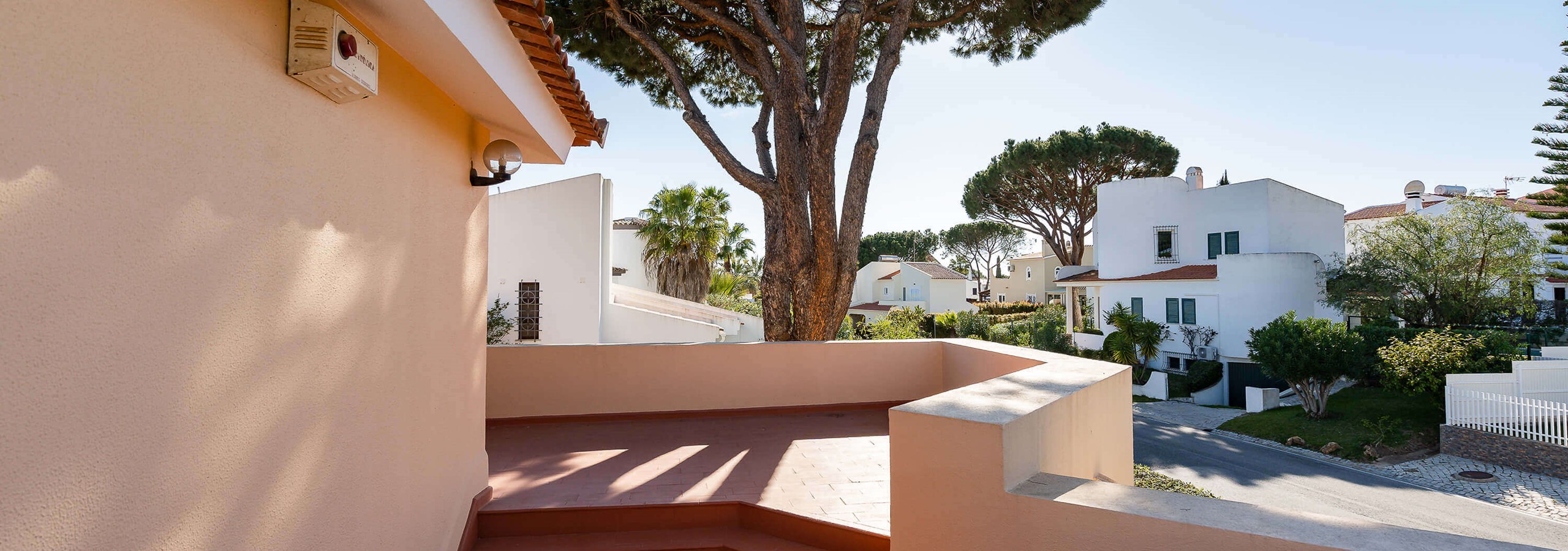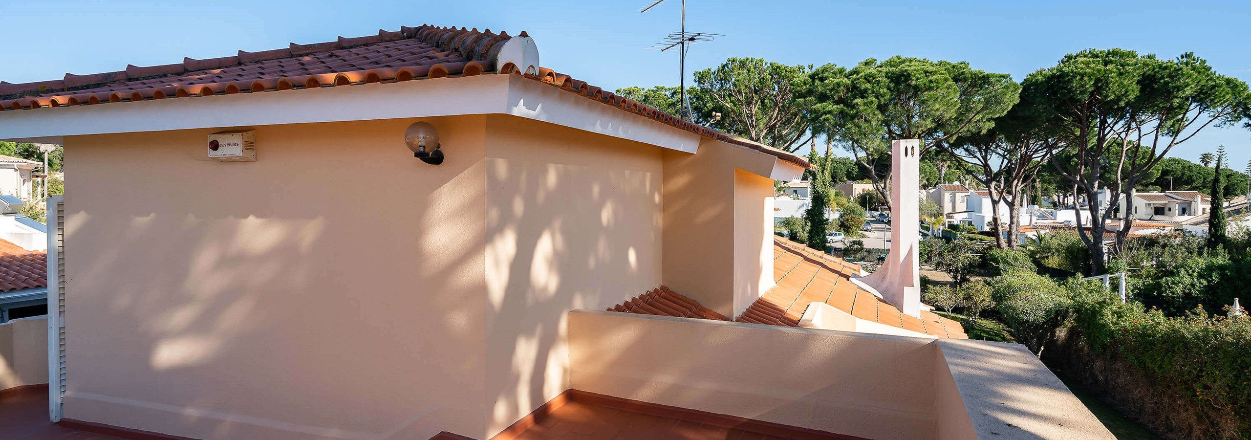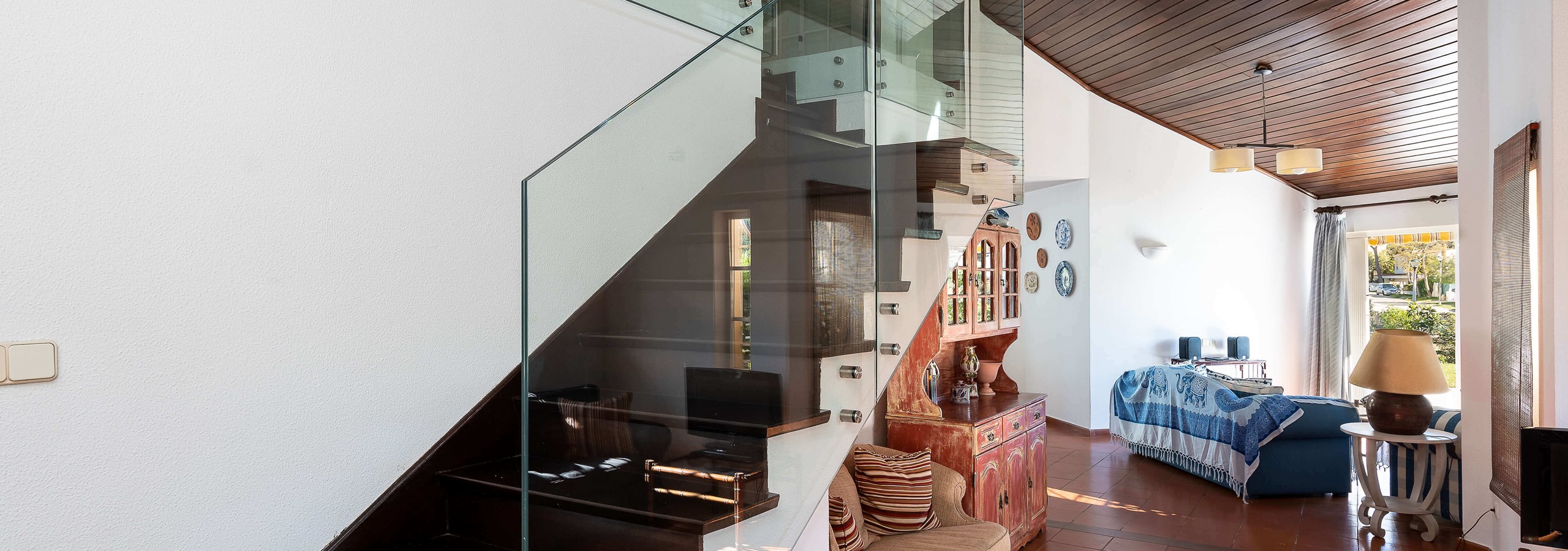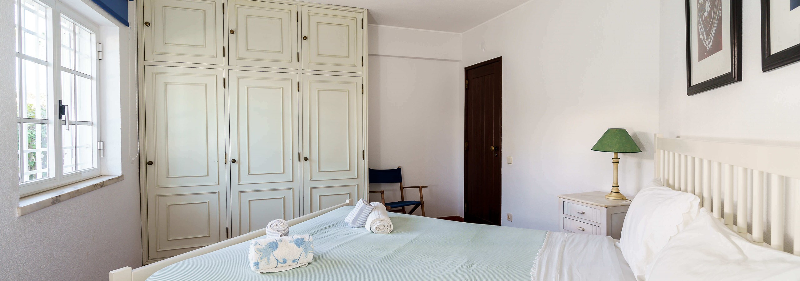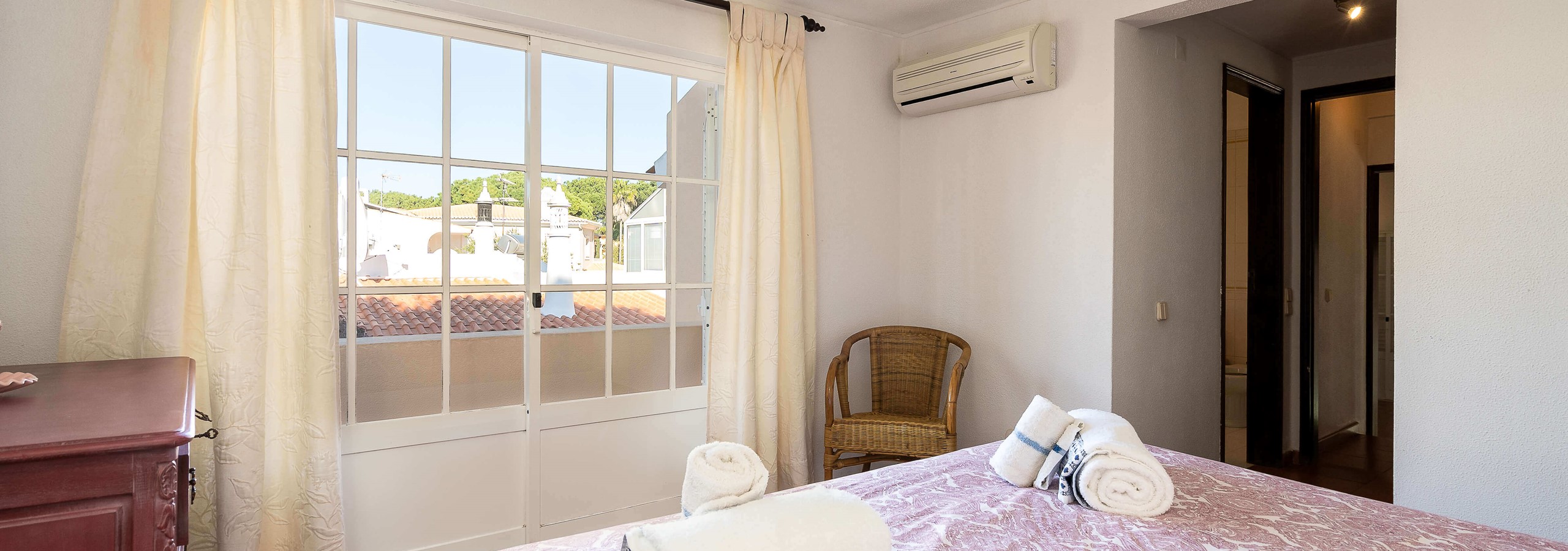 O quarto principal, no 1º andar, beneficia de acesso à varanda com vista para a piscina.