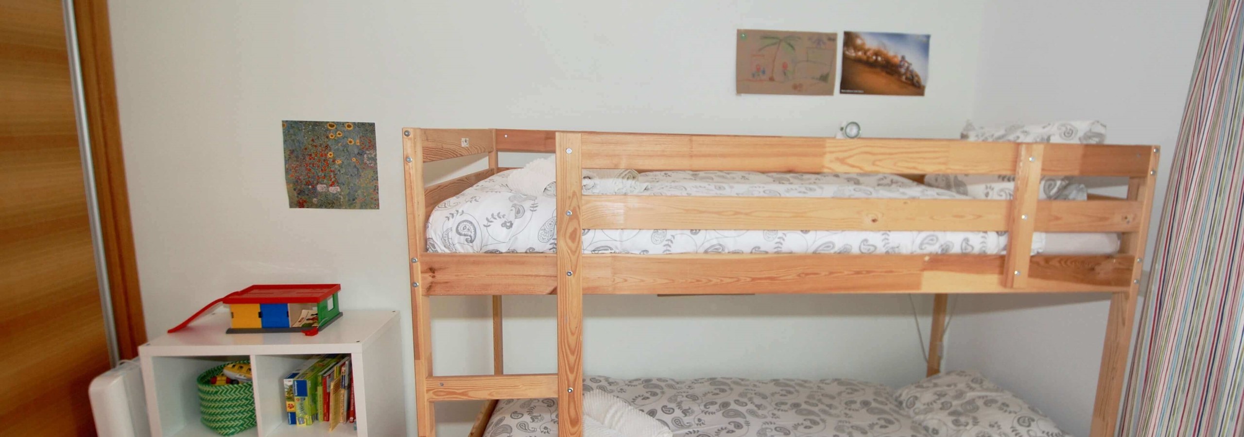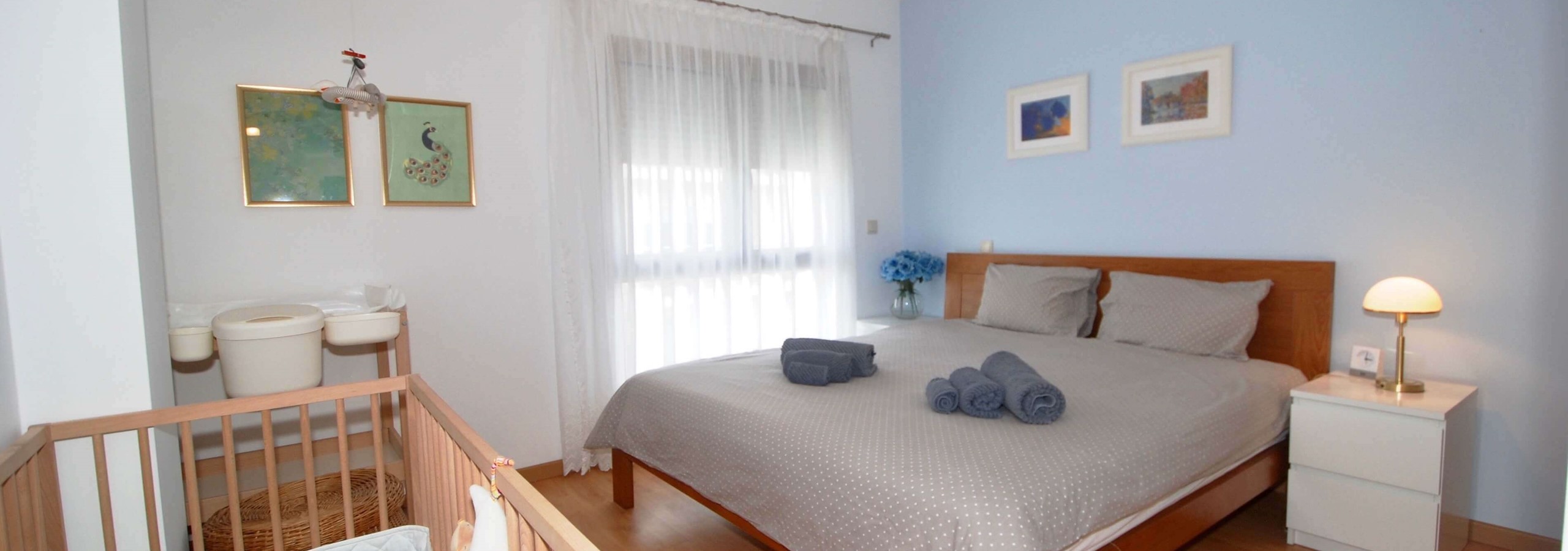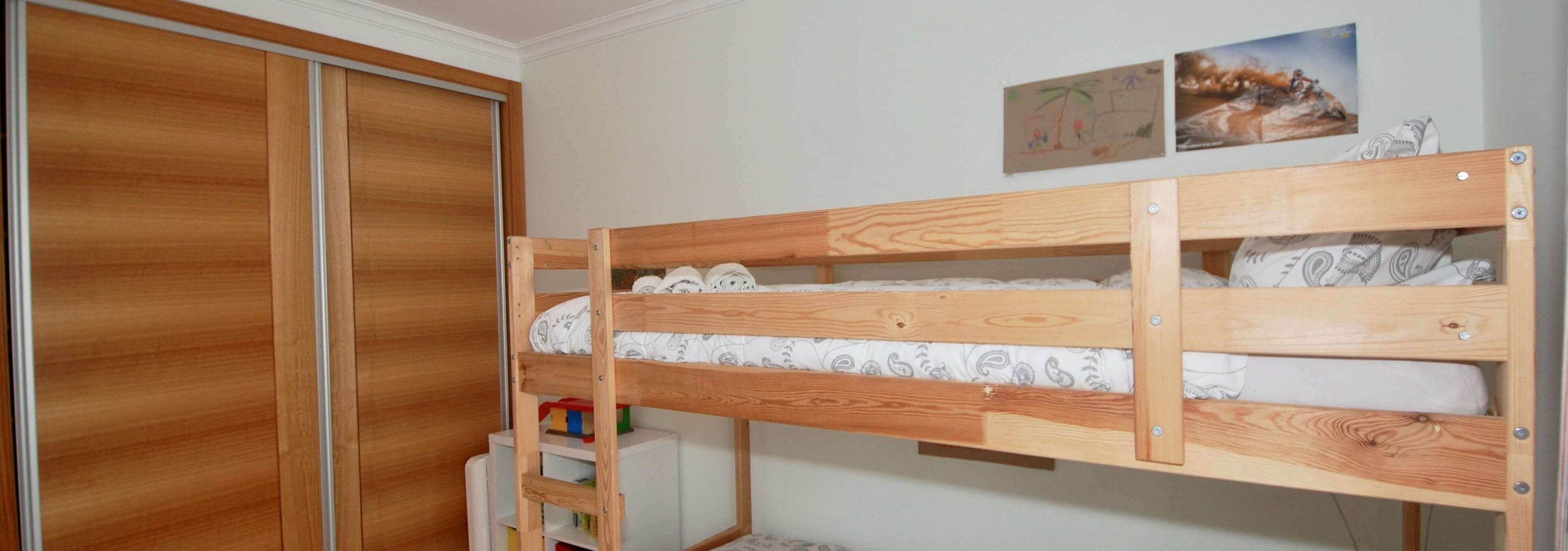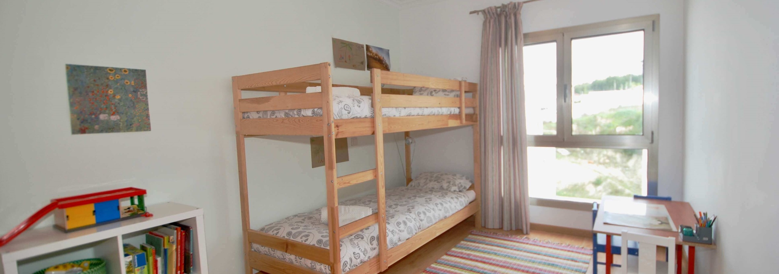 Existem 3 quartos. O quarto principal tem uma cama king-size, uma casa de banho privativa e um berço, se levar um bebé. O segundo quarto tem uma cama de água king-size e o terceiro quarto tem beliches. Todos os três quartos são luminosos, de tamanho generoso e têm armários embutidos.