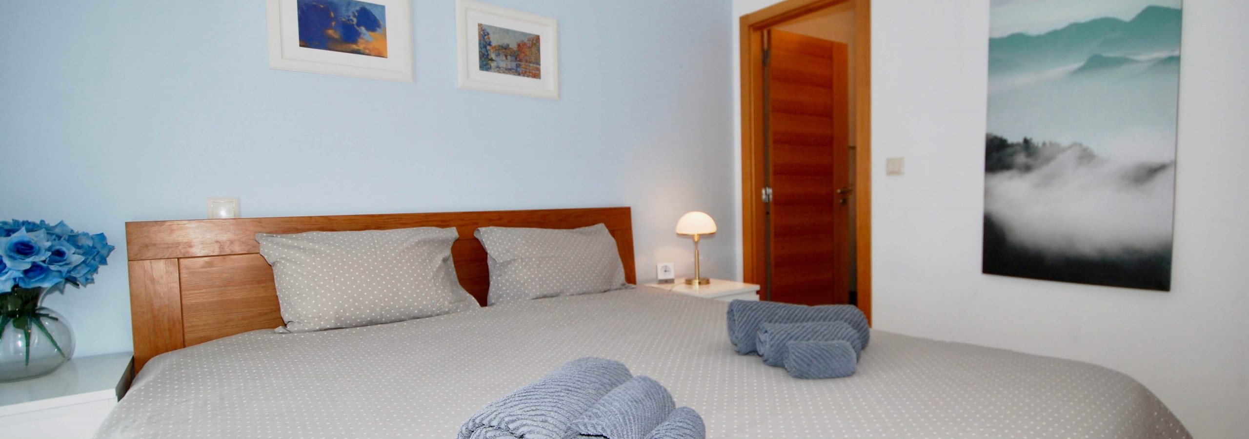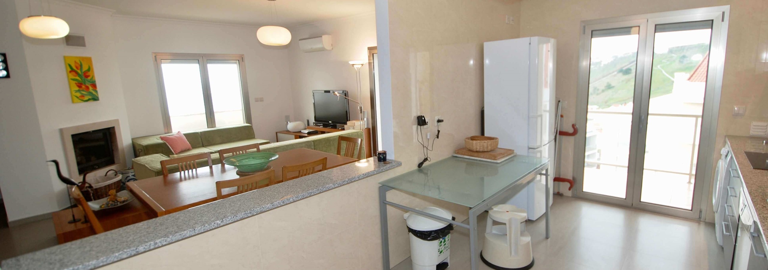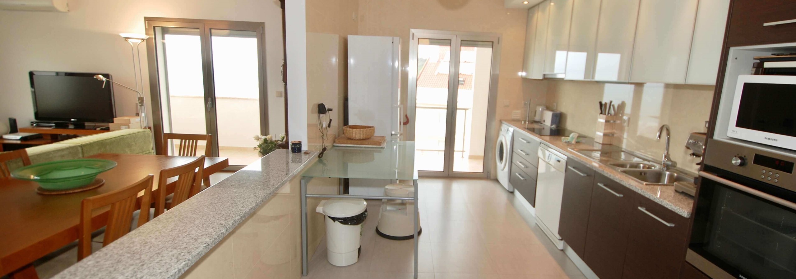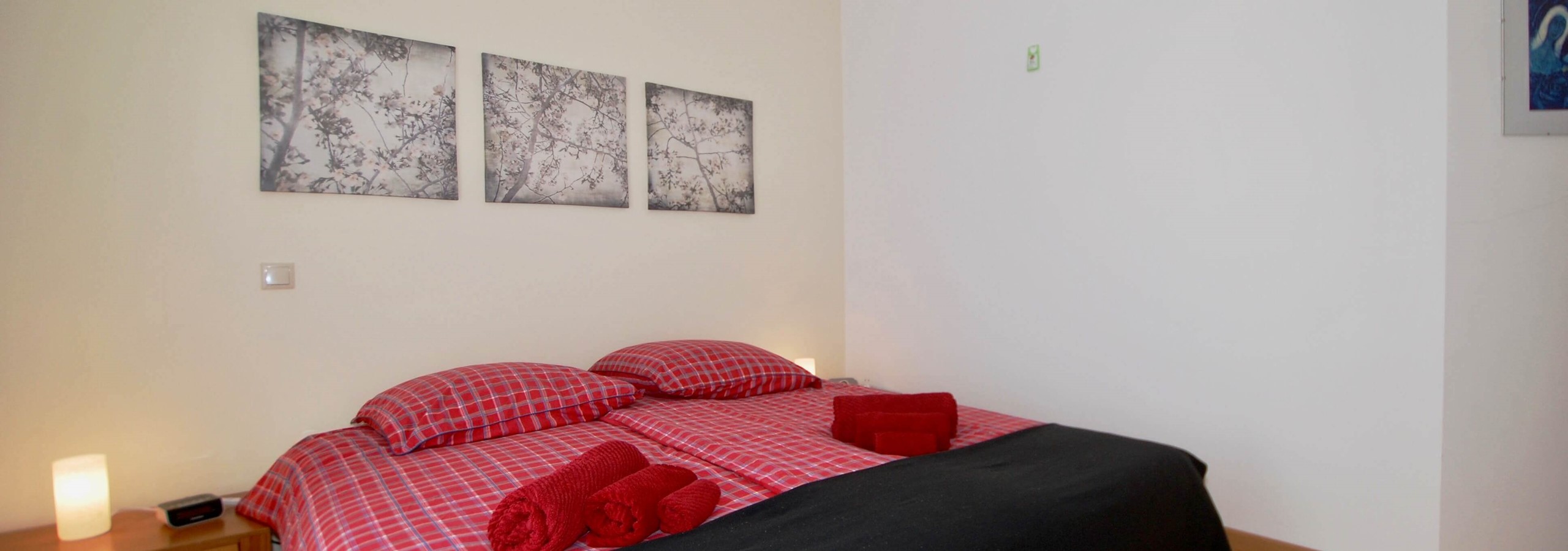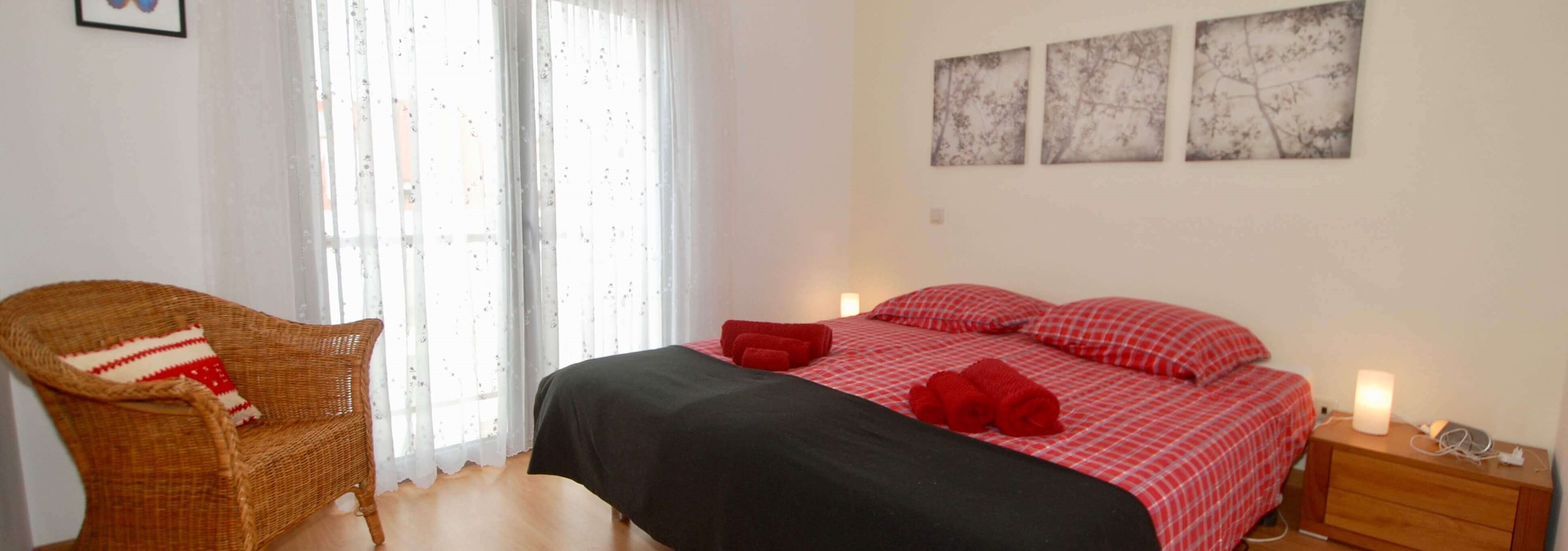 Existem 3 quartos. O quarto principal tem uma cama king-size, uma casa de banho privativa e um berço, se levar um bebé. O segundo quarto tem uma cama de água king-size e o terceiro quarto tem beliches. Todos os três quartos são luminosos, de tamanho generoso e têm armários embutidos.