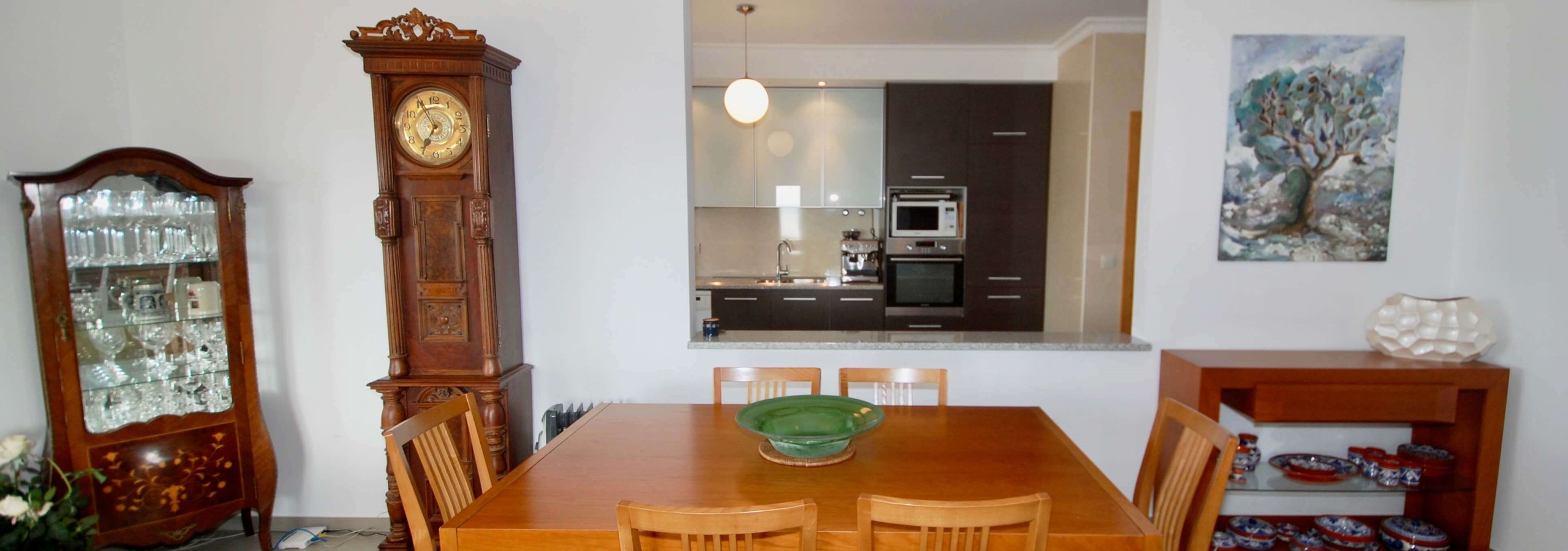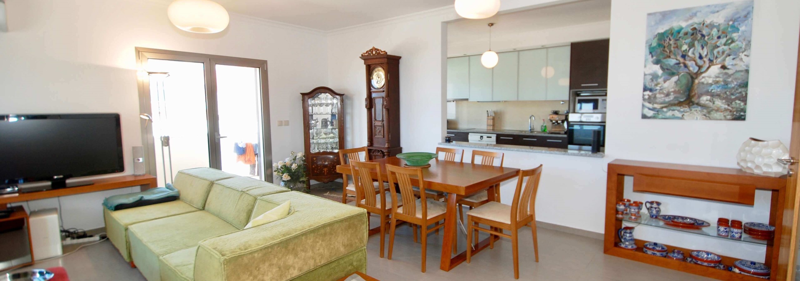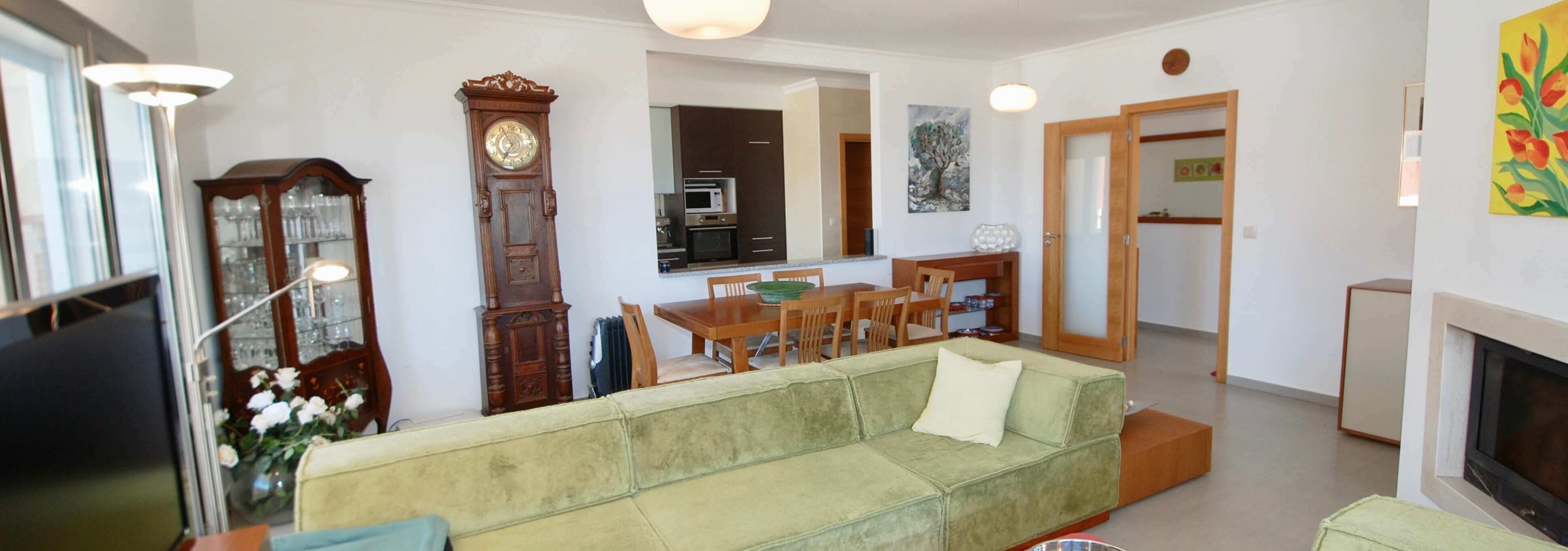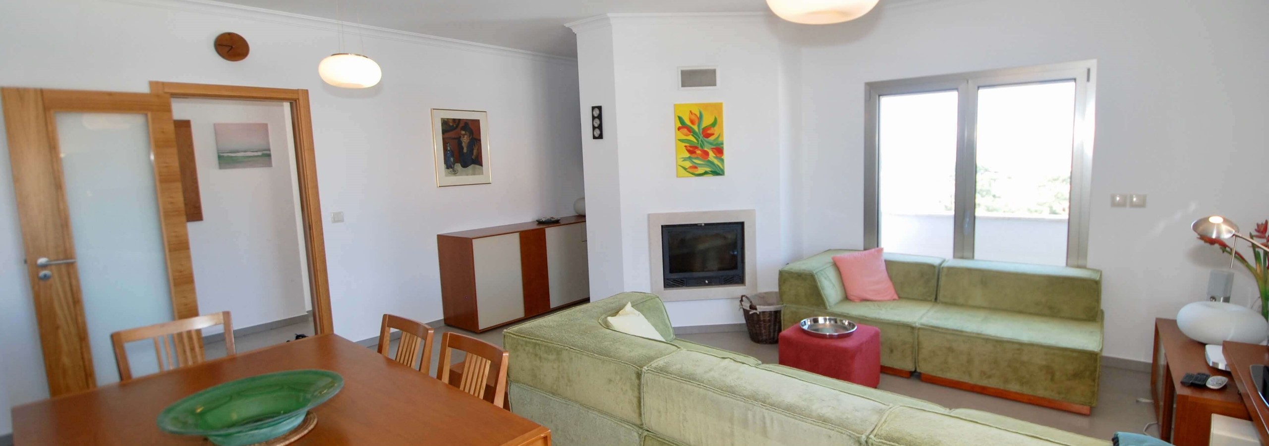 Existem 3 quartos. O quarto principal tem uma cama king-size, uma casa de banho privativa e um berço, se levar um bebé. O segundo quarto tem uma cama de água king-size e o terceiro quarto tem beliches. Todos os três quartos são luminosos, de tamanho generoso e têm armários embutidos.