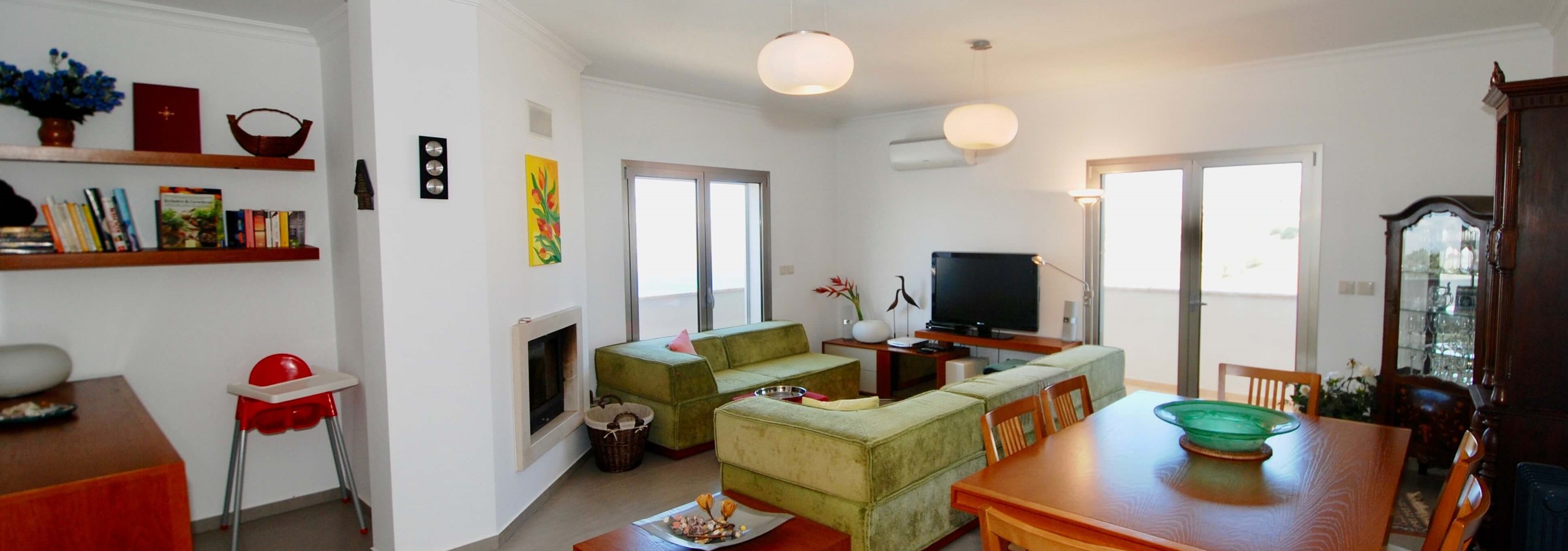 A área de estar é espaçosa, com assentos confortáveis, TV grande com canais por cabo e sistema estéreo, leitores de CD e DVD e uma seleção de jogos e brinquedos para manter as crianças ocupadas. O proprietário forneceu WiFi gratuito para a propriedade. Existe uma lareira para os meses mais frios, que é livre de usar (lenha não fornecida). A área de jantar pode acomodar 6 pessoas e há uma cadeira alta disponível, caso precise. A sala de estar e a área de jantar estão ligadas à cozinha, esta é uma ótima configuração para manter todo o grupo unido e envolvido enquanto se preparam as refeições. A cozinha em si é grande e extremamente bem equipada. Tem zona de refeições e dá acesso a uma varanda onde tem um barbecue à sua disposição.