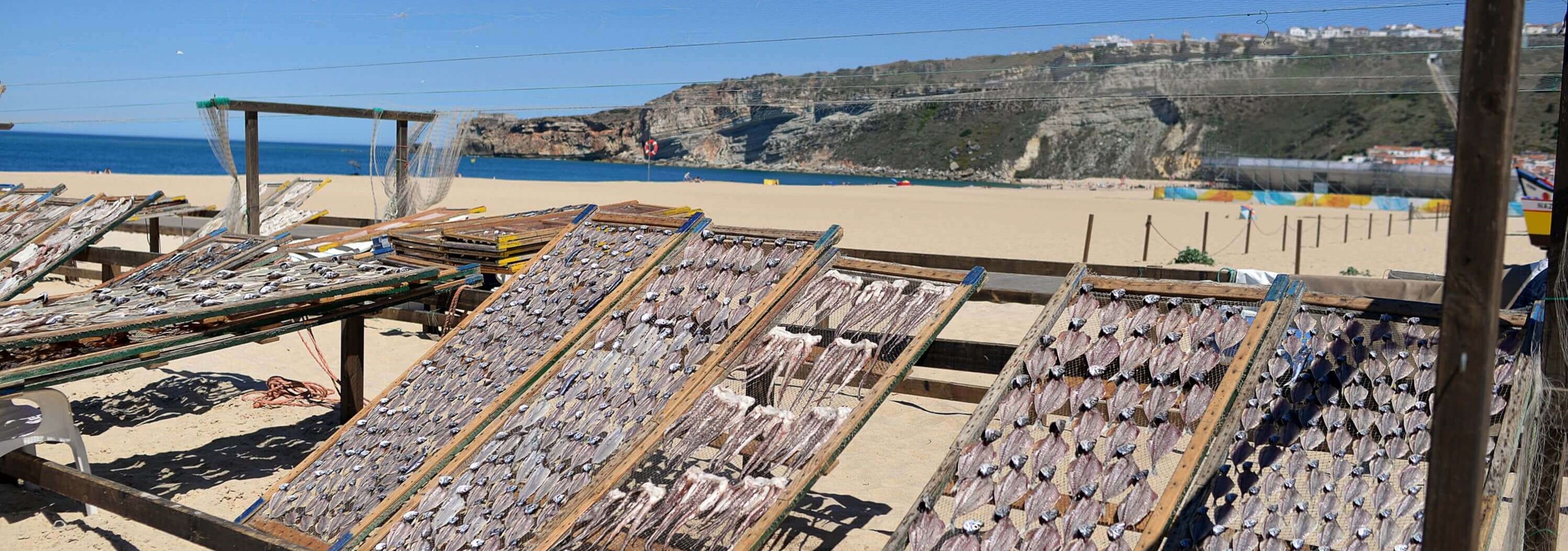 hoje com as inúmeras linhas de peixe secando ao sol ao longo da